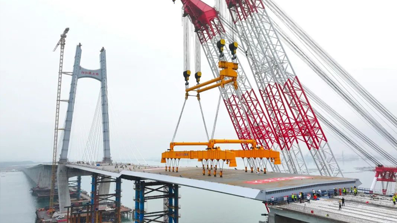3月30日上午10时02分 随着最后一块钢箱梁成功吊装到位 阳江港大桥顺利合龙 如一条巨龙横卧海面 标志着广东省滨海公路 海陵大堤段至溪头段实现全线贯通 向通车目标迈出了重要一步! 阳江港大桥全长4777.2米 是广东滨海旅游公路阳江海陵大堤 至溪头段公路项目的控制性工程 由保利长大工程有限公司承建 巨力索具负责该项目钢箱梁吊具制作 钢箱梁采用大节段吊装方案,分6个节段 最大梁段长90米,最小梁段长74.5米