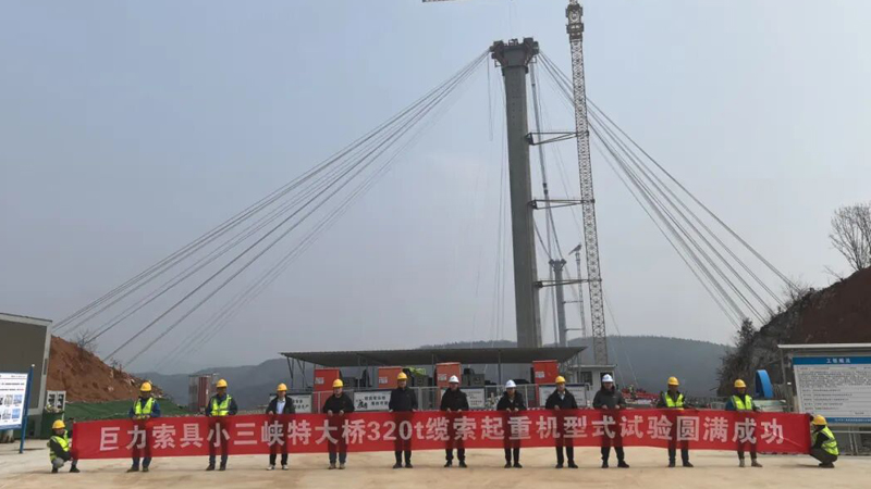 由巨力索具研发的丹江小三峡特大桥缆索起重机系统顺利完成安装调试,成功完成首节钢箱梁吊装,标志着这一国家重点桥梁工程迈入主体施工的关键阶段。