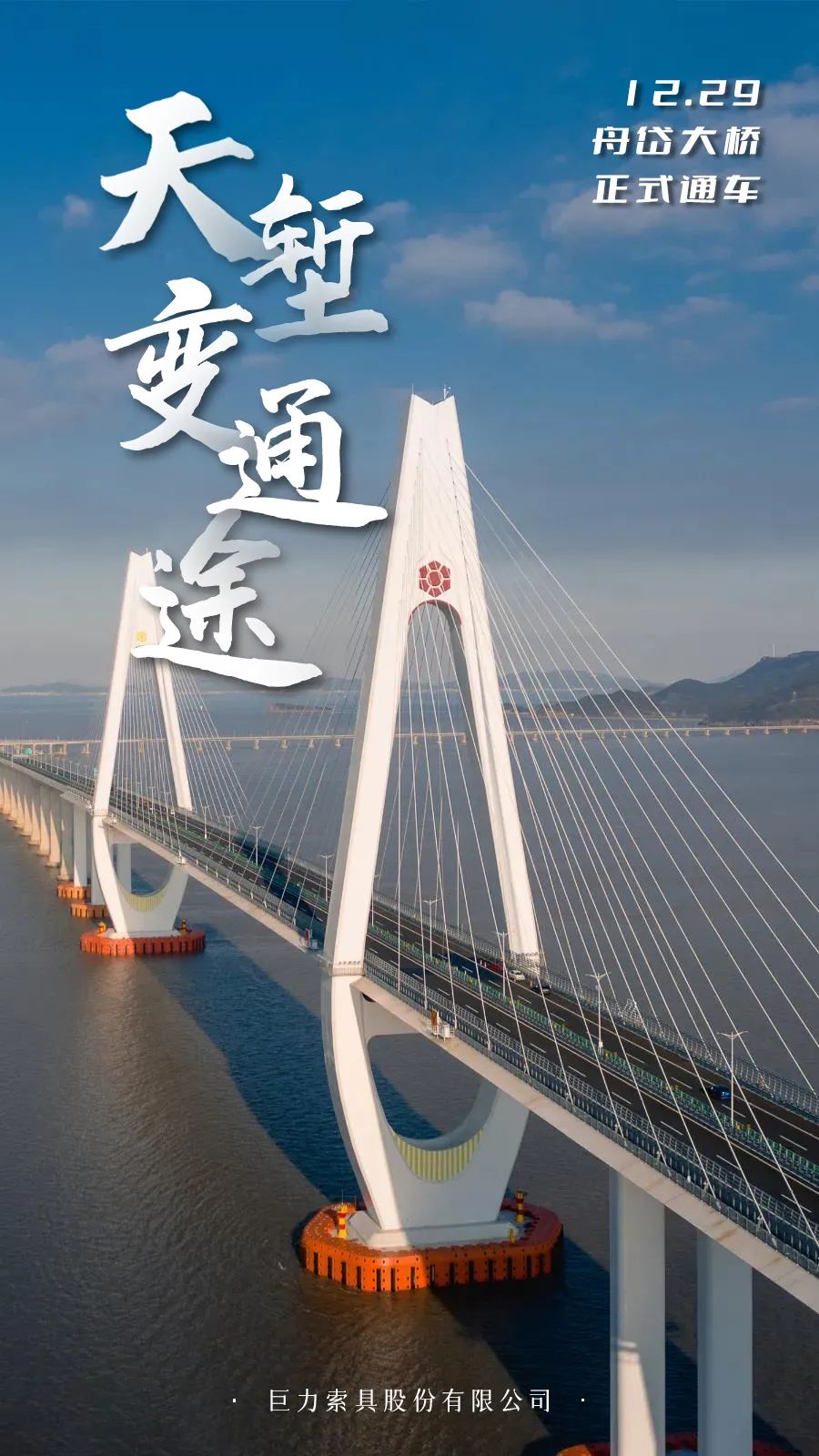 宁波舟山港主通道项目作为沪舟甬跨海大通道的重要组成部分,建成后与甬舟高速相连,使舟山连岛工程总建设里程达到83公里,跨越8个岛屿,拥有10座大桥,除舟岱大桥,巨力索具还承接了南通航孔桥、富翅门大桥、金塘大桥的斜拉索安装工作。