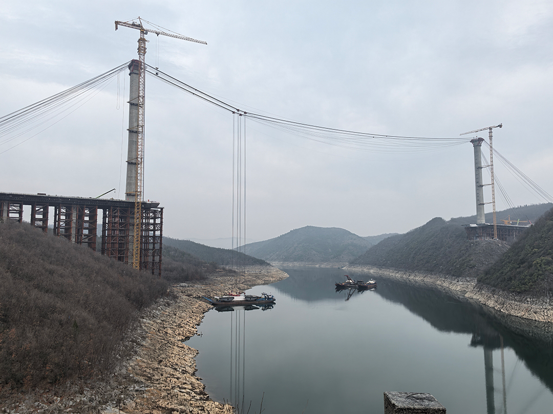 丹江小三峡特大桥地处鄂豫交界的丹江口水库库区,是连接南北交通的重要节点工程。大桥全长919米,主跨536米,是目前国内最大跨径跨峡谷分离式混合梁斜拉桥,横跨陡峭峡谷,施工环境复杂,传统吊装设备难以满足高空、大跨度、重载荷的作业需求。巨力索具针对项目特点,量身定制了双塔三跨式缆索起重机系统,其跨度、起重量及智能化控制水平均达到行业领先标准。
