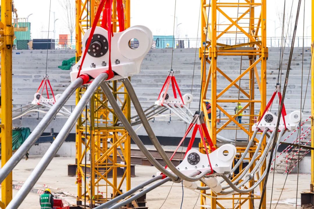 在施工过程中,巨力索具对体育中心径向索与环梁部位采用了测力销钉技术(具有拉索索力实时监测功能,可实现体育场施工及运营期间的索力监测),融合单层网壳与索承张拉技术,4700吨钢结构屋盖整体吊升,施工时在地面组装完成,56小时毫米级精准落位,刷新国内体育场馆施工纪录。