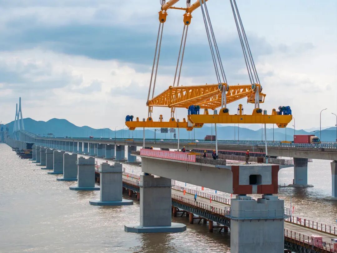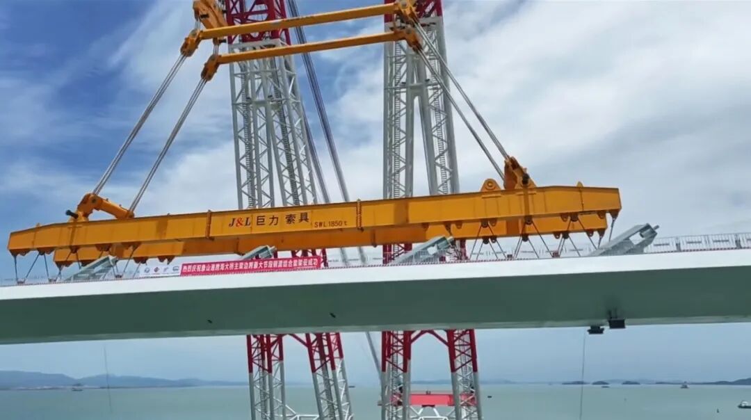 早在2024年11月,巨力索具便以定制化吊具助力该桥重达1700吨的首榀预制箱梁精准落位。该箱梁长60米、宽10.6米,是国内市域铁路工程中跨度最大、吨位最重的预应力混凝土预制箱梁,桥面至海面距离最大约52米,接近20层楼高度,且毗邻既有象山港公路大桥,操作空间狭小,对吊具稳定性、吊装精度和施工安全性要求极高。