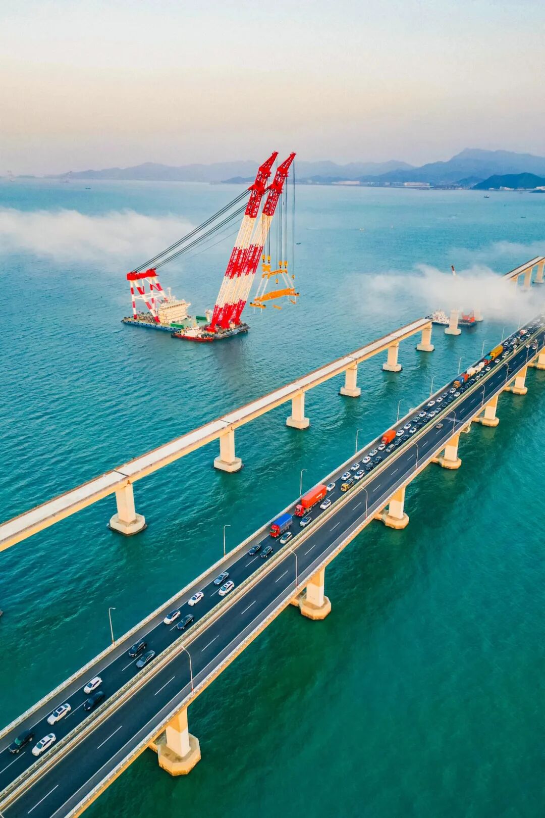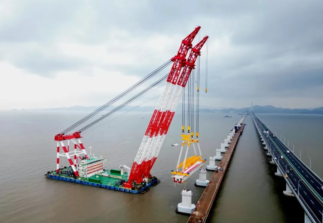 此次架设的钢梁长107.5米,重约1779吨,加吊具总重2182吨,相当于1500辆家用轿车的重量,桥面至海面最大高度达53米(近20层楼高),钢梁架设区域毗邻既有象山港公路大桥,船舶站位紧邻主航道,往来船只流量大,施工空间狭小、船舶通航密集,对吊装精度与稳定性提出严苛要求。