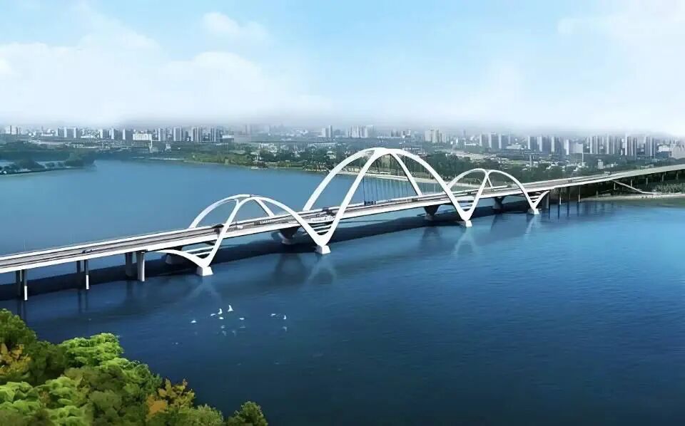 主桥桥型为五跨飞燕式中承钢箱梁提篮拱桥,多拱造型模拟“湘江碧波”的流动形态,平直梁面则寓意河流静态水面,一动一静相结合的简洁立体造型彰显着工程智慧。
