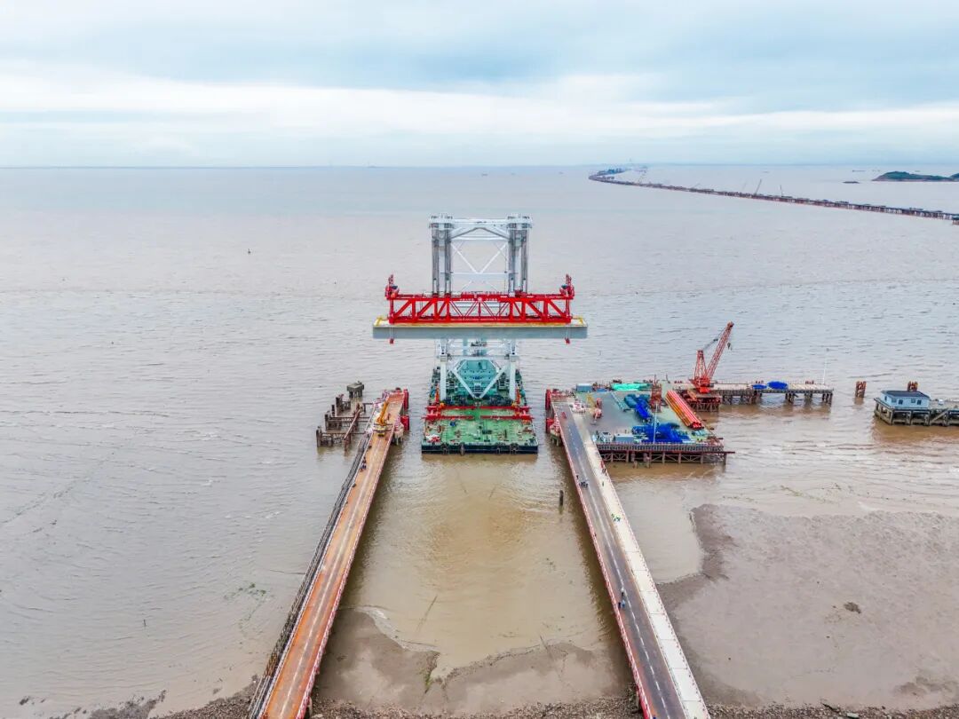 杭州湾跨海铁路大桥全长约29.2公里,设计时速350公里,是新建南通至宁波高速铁路的控制性工程。建成后,将成为我国“八纵八横”高铁网沿海通道的重要组成部分,对完善区域路网结构布局,方便沿线人民群众出行,推进长三角一体化高质量发展具有不可估量的意义。目前,大桥建设正按计划稳步推进,预计2026年底将完成海中引桥主体工程,2027年底建成通车。