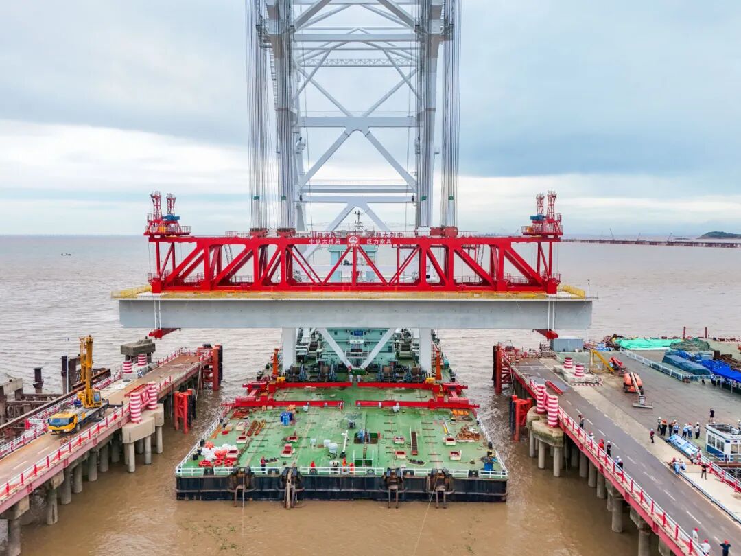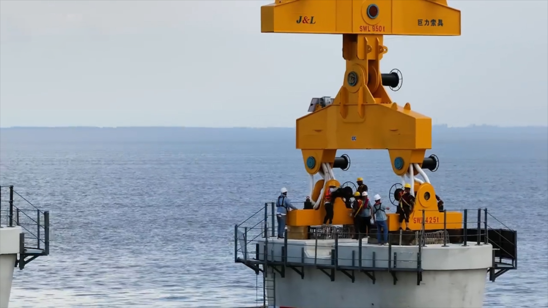 巨力索具生产制造的预制箱梁吊具与中铁大桥局研制的“天一号”运架一体船协同作战,采用“低平潮取梁、涨潮期运输、平潮期落梁”的精准调度方案,克服了海域潮汐变化大、海上风浪干扰强、运输距离长等诸多施工难题,将落梁误差控制在毫米级,最终将这新一代“世界梁王”架设到位。