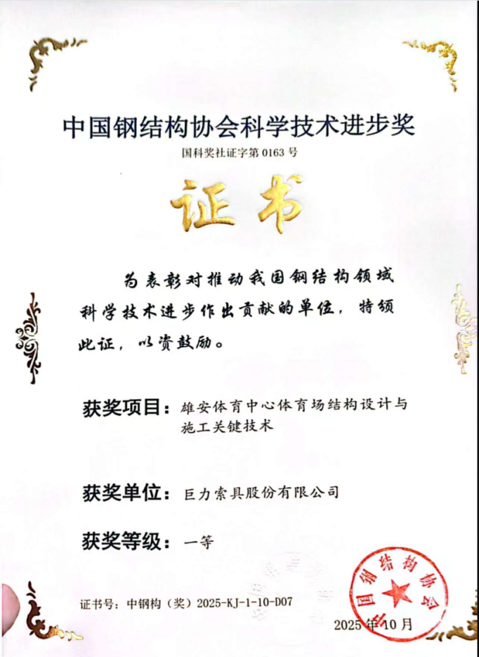 “一次荣获三项一等奖,是对巨力索具研发团队创新能力的高度肯定,更是我们多年来坚持‘技术驱动未来’理念的集中体现。”公司技术负责人表示,“这些成果的落地,离不开行业专家的指导,更离不开业主、设计院、监理、总包等各方伙伴的信任与支持。”未来,巨力索具将继续深耕索具核心技术研发,聚焦绿色建筑、智能建造、新材料应用等方向,持续推动行业技术进步,致力于成为全球索具系统解决方案的引领者。