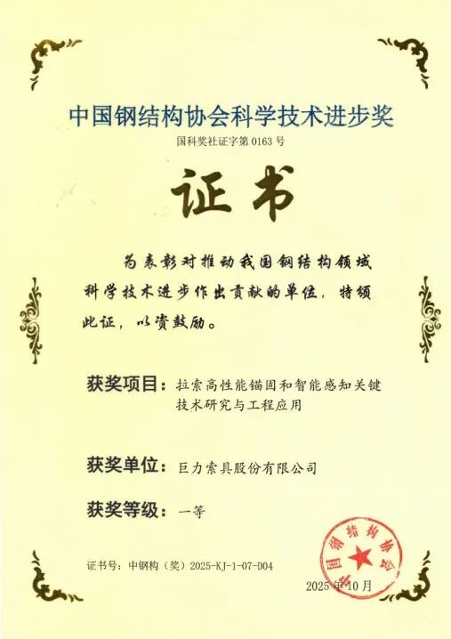 近日,2025年度中国钢结构协会科学技术进步奖评审结果揭晓。在10月14日于广西南宁举行的颁奖典礼上,巨力索具股份有限公司凭借卓越的技术研发实力,一举斩获三项一等奖,充分彰显了公司在高端索具技术领域的创新引领地位。
