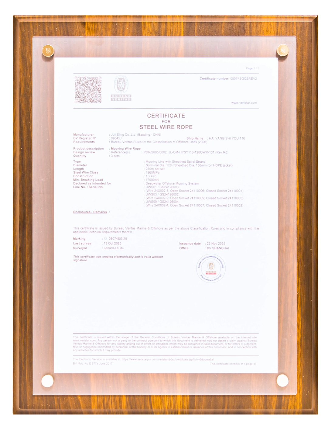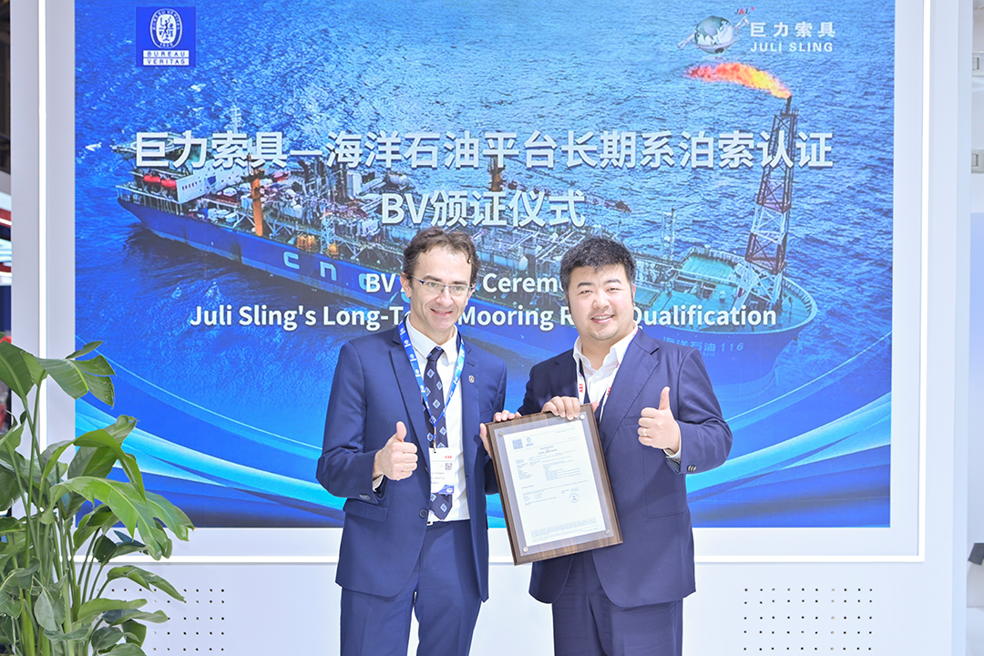 巨力索具常务副总裁李彦英表示:“这项认证是针对海洋石油平台长期系泊索这一技术门槛领域的专项认证,是对我们深耕深海装备技术的最佳注脚。海洋石油平台长期系泊索不仅要满足高强度要求,更要在抗疲劳、耐腐蚀和长期可靠性方面表现卓越。BV的认可,证明我们的产品完全符合国际最高安全标准。”