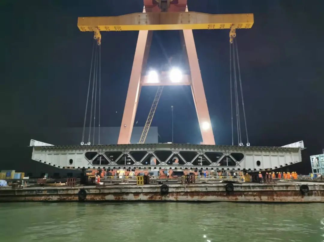 深中通道G05标段泄洪区及浅滩区钢箱梁大节段XG9L的出海平台方案为世界首创的出海运输方案,整个运输过程使用8台模块车,4台移梁平车,顶升运载能力可达2000吨。经过三次顶升及运输,将钢箱梁大节段XG9L从存梁区运至待装船区,由世界第二起重能力的“天一号”运架一体船将钢箱梁吊运至桥址。